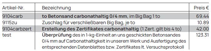 Für baustellenbezogene Nachweise an carbonathaltigem Betonsand 0/4 mm* bieten wir nach einem betriebsintern entwickelten Prüfverfahren den „TEST KÜHNE-IDEAL®“ an. Der von Ihnen im 1-kg-Beutel kostenlos zur Verfügung gestellte Betonsand 0/4 mm wird im Betonwerk Kühne auf Carbonathaltigkeit überprüft, ein entsprechendes Datenblatt bzw. ein