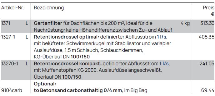 Alle Zubehörteile sind auf die Sicker-Zisternen „2 in 1“ abgestimmt und unterstützen eine effiziente Regenwasserbewirtschaftung und langlebige Systemfunktion.