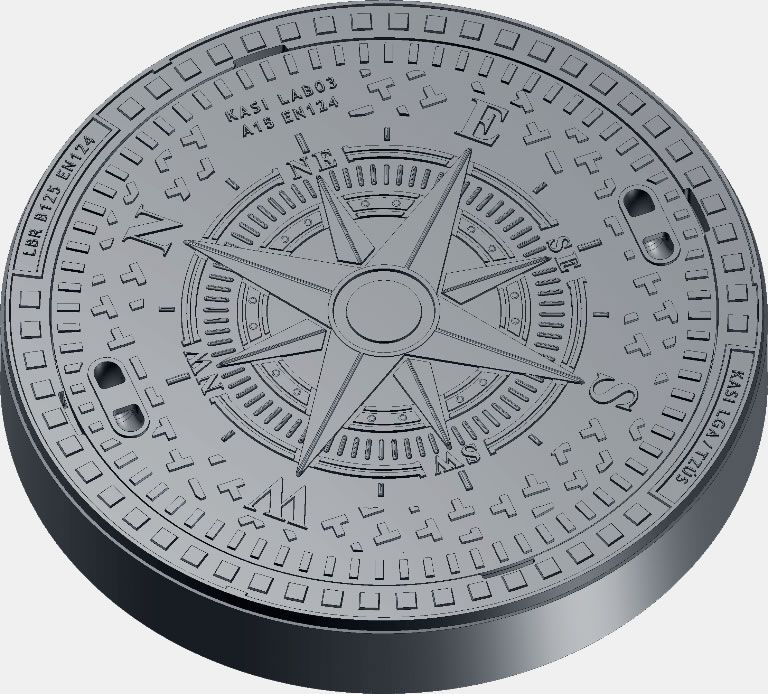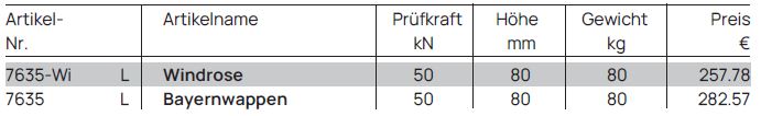 Die Sondermotiv-Deckel „Windrose“ und „Bayernwappen“, die wir im Sortiment haben, haben eine Höhe von 80 mm und sind befahrbar bis 50 kN Kl. A.