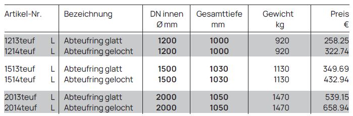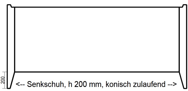 Der Abteufring als Sonderbauteil besteht aus einem Schachtring mit angeformtem Senkschuh am unteren Schachtfalz. Der Senkschuh ist 200 mm lang. Durch die angeformte, 200 mm lange Spitze am Schachtringende gräbt sich der Schachtring als erster gesetzter Ring in den Boden. Nachfolgende Schachtringe werden auf den Abteufring aufgesetzt und werden bauseits durch ein Bandeisen miteinander zugfest verbunden. Unsere Abteufring mit Falz werden gerne für Brunnen- und Sickeranlagen verwendet.