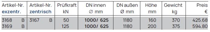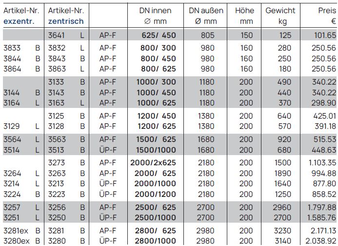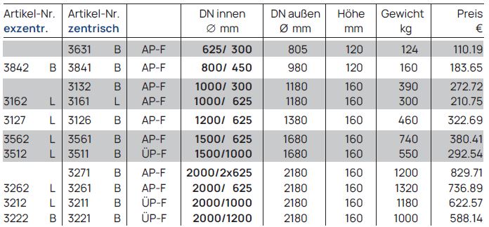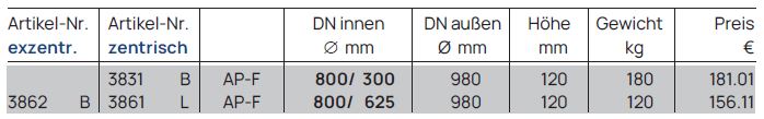 Diese Abdeck-/ Übergangsplatte dient als Verbindungsstück, um eine Schachtöffnung von einem größeren Durchmesser (z. B. DN 2000) auf ein kleineres Maß (z. B. DN 625 für den Einstieg, DN 1000 für weiterführendes Schachtmaterial) zu reduzieren. Die Einstiegsöffnung kann zentrisch (mittig) oder exzentrisch (versetzt) angeordnet sein, um beispielsweise das Einsteigen über Steigeisen zu erleichtern.