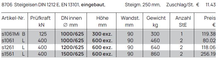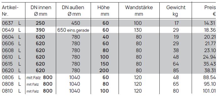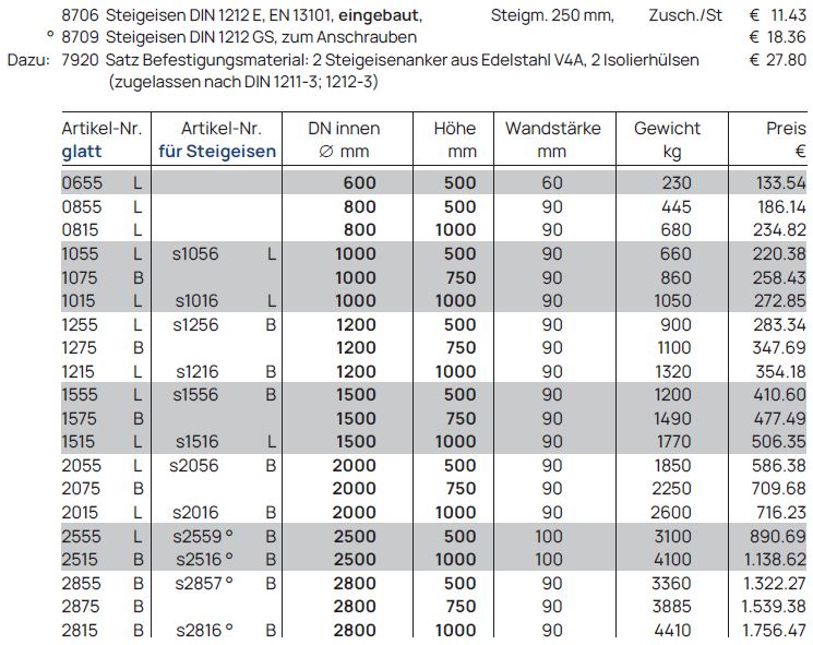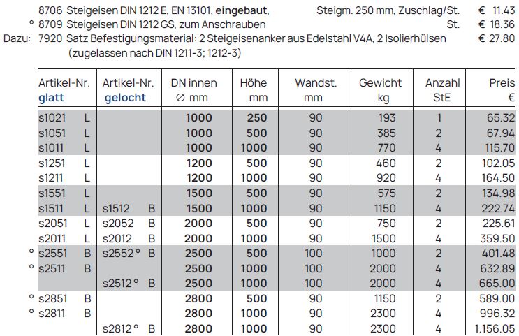 Schachthälse mit Falz und eingebauten Steigeisen bilden den oberen Abschluss von Einstiegs- und Kontrollschächten in Brunnen- und Sickeranlagen. Sie ermöglichen einen sicheren Zugang zum Schacht und unterstützen Wartungs-, Kontroll- und Reinigungsarbeiten.