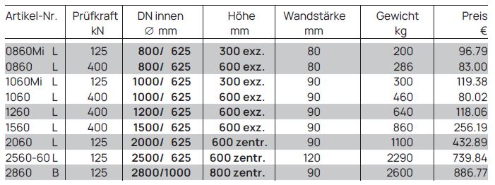 Bei uns finden Sie Sickerschächte nach DIN 4034/2, 3.1 (zum Versickern von Niederschlagswasser oder gereinigtem Abwasser), Schächte für Brunnenanlagen nach DIN 4034/2, 3.1-23.2 (runde oder eckige Abschlussbauwerke von Brunnen) und Einstiegs- und Kontrollschächte für Brunnen- und Sickeranlagen nach DIN 4034/2:2013-05,7.
