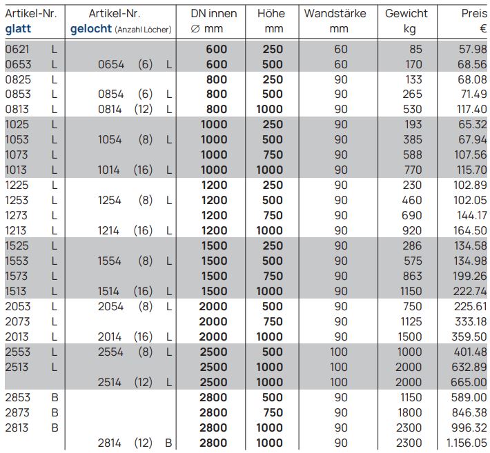 Die Schachtringe sind wahlweise glatt oder gelocht erhältlich, je nach Einsatzbereich. Gelochte Schachtringe ermöglichen eine gezielte Versickerung in den umliegenden Boden, während glatte Ringe für geschlossene oder statisch beanspruchte Bereiche eingesetzt werden.