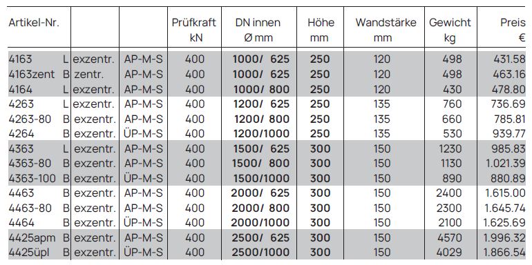 Übergangsplatten nach DIN V 4034/1 EN 1917 Typ 2 ermöglichen eine verjüngte Weiterführung von Betonschächten und sorgen für eine stabile Verbindung zwischen unterschiedlichen Schachtdurchmessern. Sie sind ein wichtiger Bestandteil moderner Schachtbauwerke im Kanal- und Tiefbau und gewährleisten eine sichere und normgerechte Konstruktion.