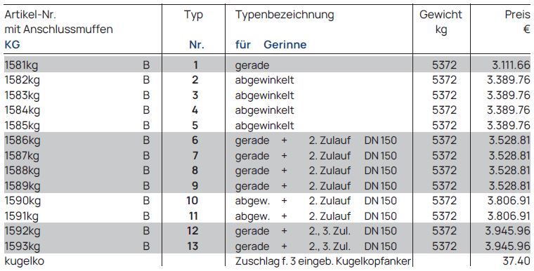 Gerinne DN 150, Bauhöhe 1250 mm, Stzg.-Halbschale, Anschlüsse für KG oder PP