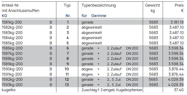 Gerinne DN 200, Bauhöhe 1300 mm, Stzg.-Halbschale, Anschlüsse für KG oder PP