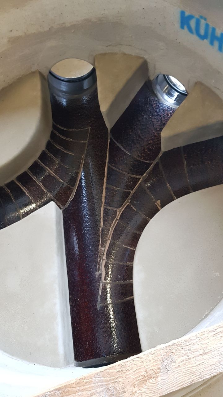 Gerinne DN 150 mit Steinzeughalbschale bis Kämpfer, bis Scheitel in Beton ausgeführt.